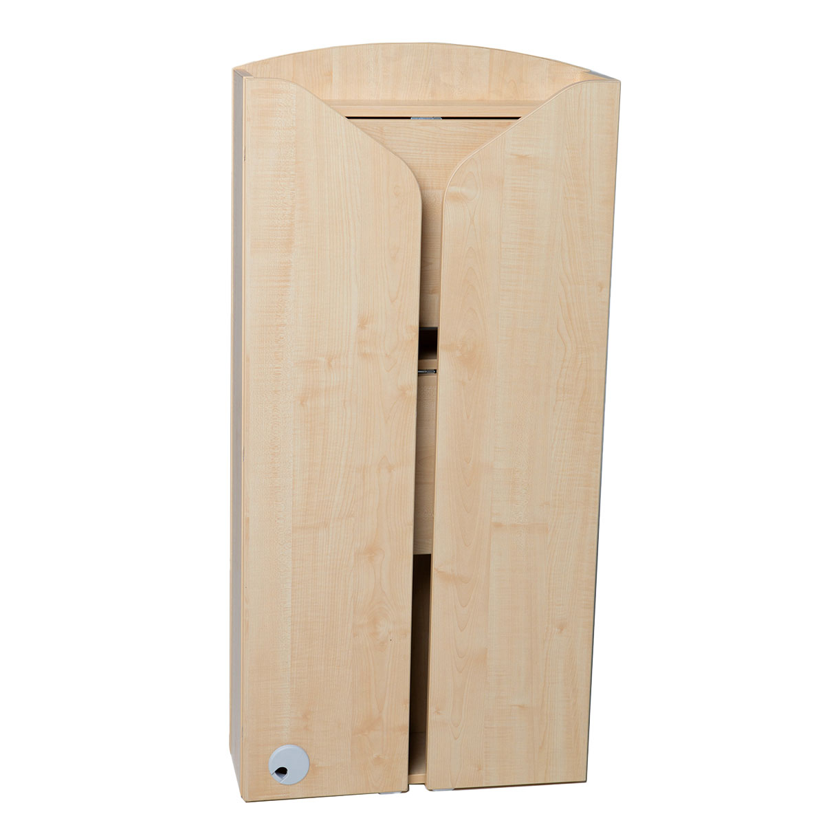 An attractive new lectern that folds inwards for storage. The angled platform is adjustable to 20° and 40° to suit a laptop/tablet or paper notes and cable management is provided through to ground level. Three finishes are available Black, Maple, or Beech.