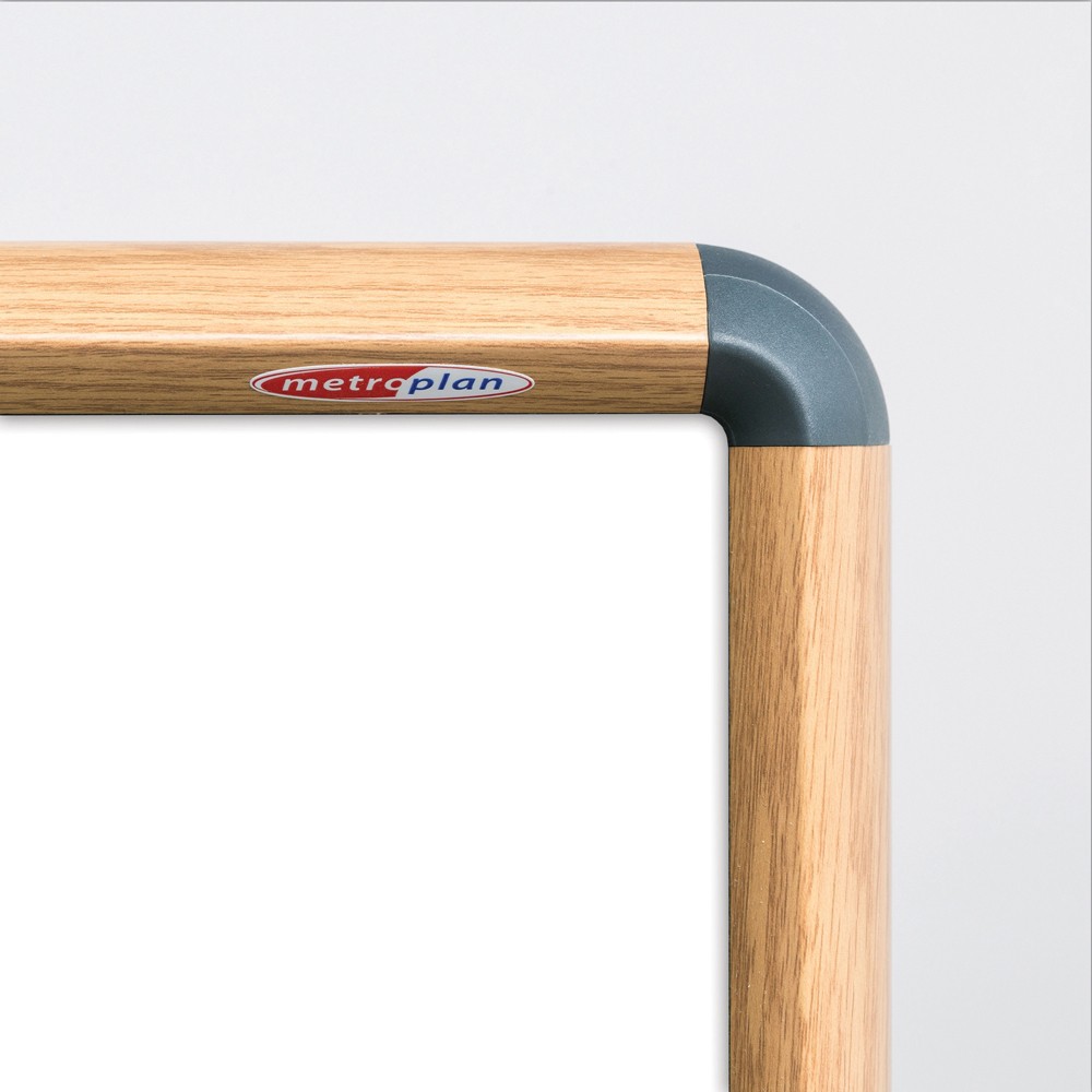 Deluxe wood effect contour framed magnetic whiteboard in a light oak finish.