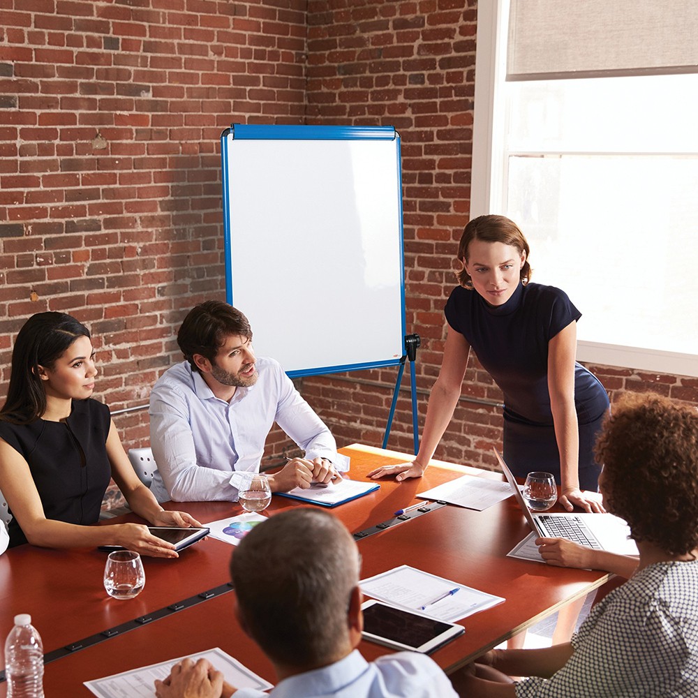 - Double sided magnetic whiteboard can be angled to aid presentation, and is fully height adjustable.