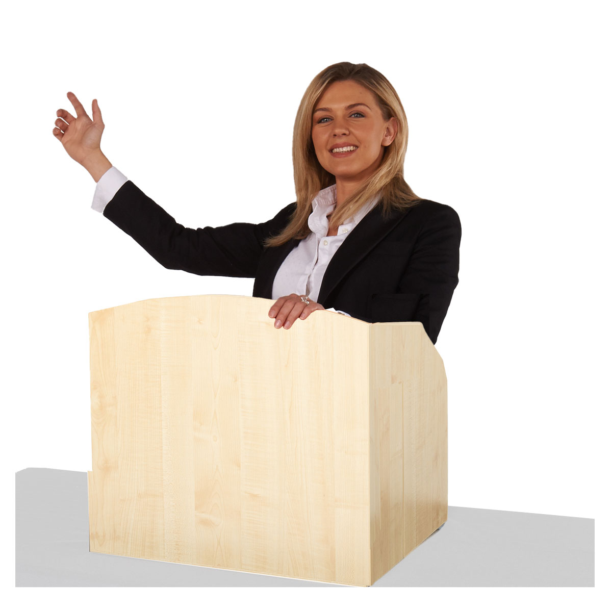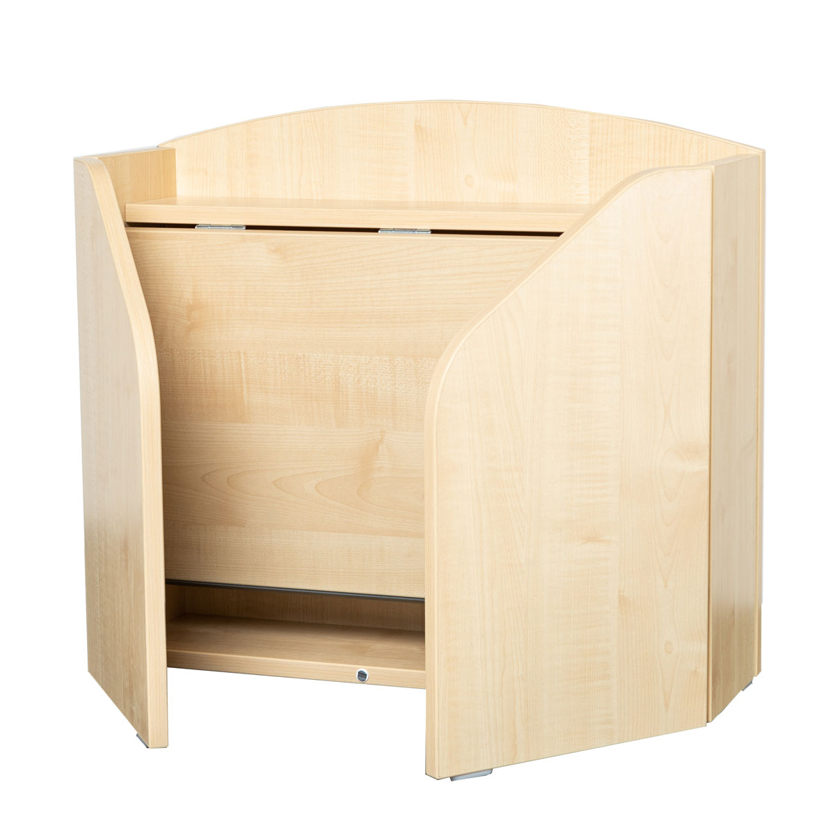 A traditional looking desktop lectern with a large sloping shelf and paper ledge.