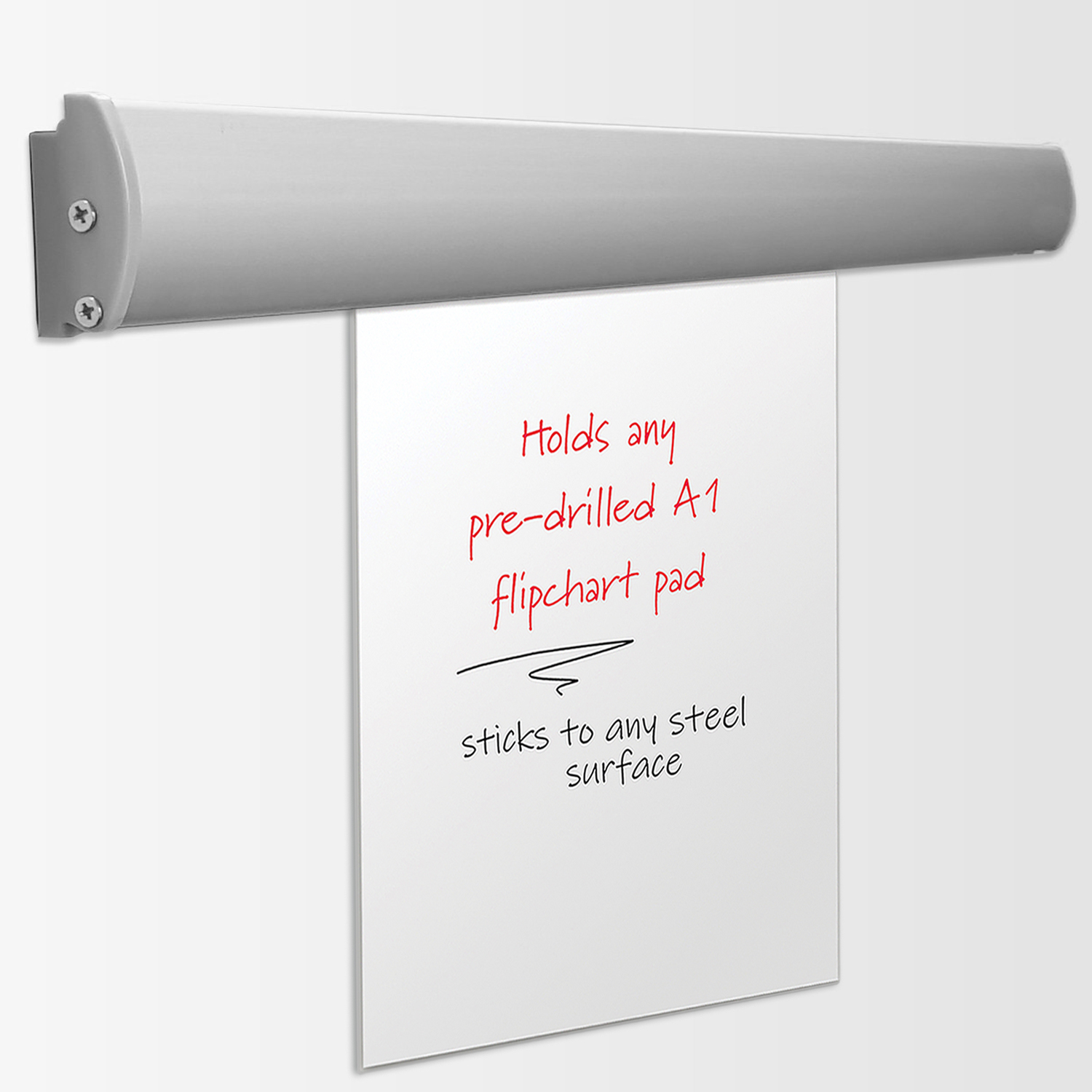 Holds any pre-drilled A1 flipchart pad. Sprung clamp neatly covers the mounting hooks. Rear magnet adheres to any steel surface. 55 x 665 x 30mm (HxWxD). Not suitable for use with glass boards.